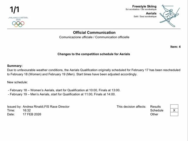 根據組委會最新發布的公告,原定于17日舉行的資格空中技巧資格賽已被重新安排至18日(女子組)和19日(男子組)。最新賽程為:2月18日為女子比賽,相距資格賽10:00開始,空中決賽13:00開始;2月19日為男子比賽,技巧決賽僅資格賽11:00開始,比賽決賽14:00開始。